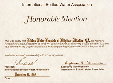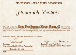 Since 1996, Living Water Fountain has served the Greater Bay Area with drinking water services, starting in Milpitas, CA. In that first year, LWF was awarded by IBWA (International Bottled Water Association) for the achievement of 95 percent score of the Good Manufacturing Practice plant inspection.