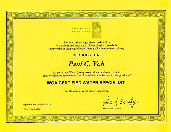 Paul Yeh, Founder of Living Water Fountain, Inc., Certified WQA Water Specialist, has been in the water treatment business for more than 20 years. He graduated from University of California, Berkeley, with a degree in Chemical Engineering. Mr. Yeh then worked overseas, as an employee for Buckman Inc. There, he managed a series of water treatment projects for a variety of paper manufacturers, leather processing factories, and sugar manufacturers. Since then, Mr. Yeh has started his career path on the track of all kinds of water treatment solutions.